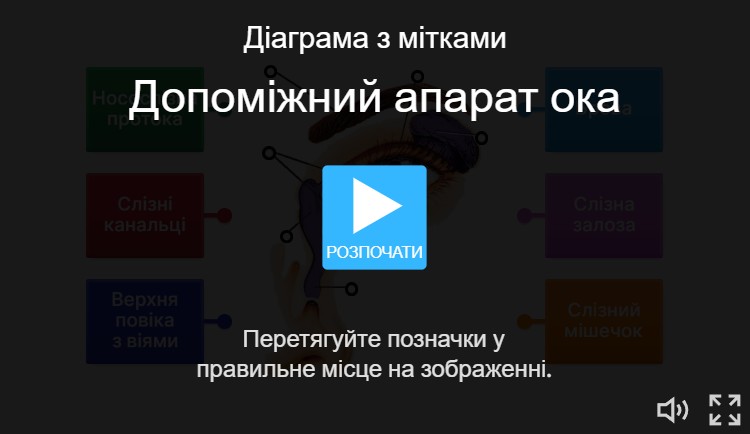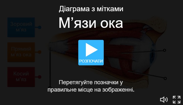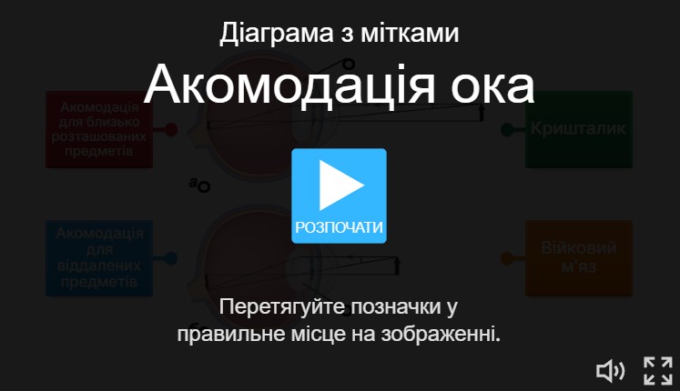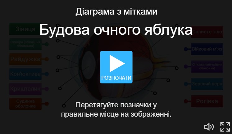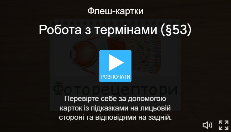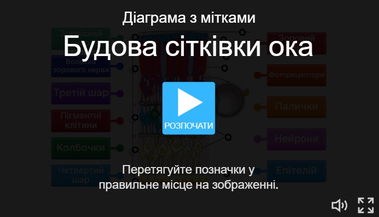 ← Повернутися назад § 52. Загальна характеристика сенсорних систем Опрацьовуємо зміст параграфа Ознайомитися зі змістом § 52 Робота з термінами (§52) Здійснюємо самооцінювання Будова слухової сенсорної системи § 53. Зорова сенсорна система. Око Опрацьовуємо зміст параграфа Ознайомитися зі змістом § 53 Робота з термінами (§53) Здійснюємо самооцінювання Будова очного яблука Допоміжний апарат ока М’язи ока Акомодація ока § 54. Сприйняття зоровою сенсорною системою світла, кольору, простору. Гігієна зору Опрацьовуємо зміст параграфа Ознайомитися зі змістом § 54 Робота з термінами (§54) Здійснюємо самооцінювання Будова сітківки ока § 55. Слухова сенсорна система. Вухо. Гігієна слуху Опрацьовуємо зміст параграфа Ознайомитися зі змістом § 55 Робота з термінами (§55) Здійснюємо самооцінювання Будова вуха Будова органа слуху Будова внутрішнього вуха Схема поширення звукової хвилі в органі слуху § 56. Сенсорні системи смаку, нюху, рівноваги, руху, дотику, температури та болю Опрацьовуємо зміст параграфа Ознайомитися зі змістом § 56 Робота з термінами (§56) Здійснюємо самооцінювання Будова смакової цибулини язика Розташування смакових рецепторів Носова порожнина Нюховий епітелій Мікроскопічна будова стінки вестибулярного апарата Рецептори шкіри ← Повернутися назад